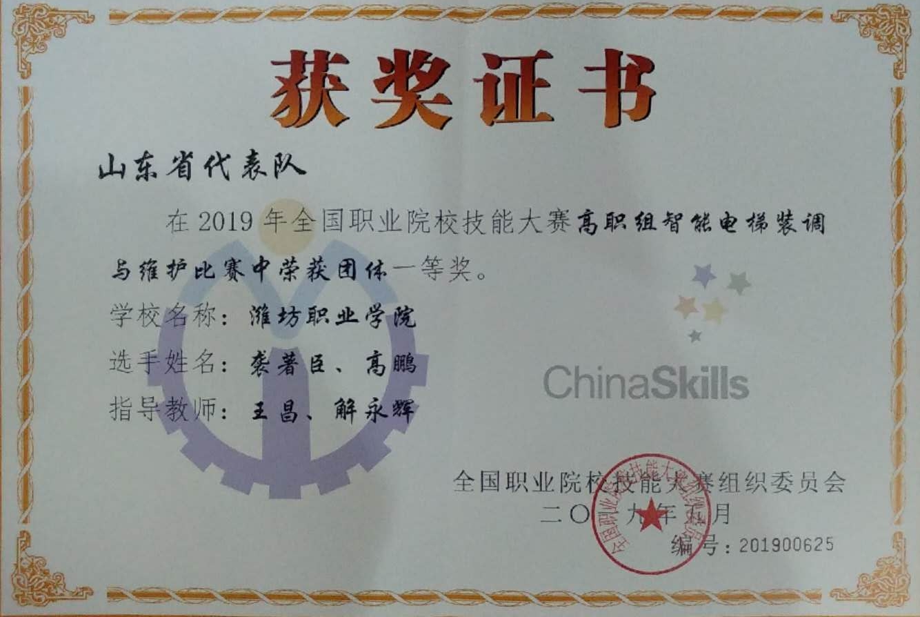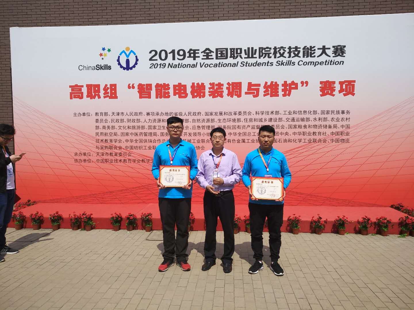 5月6日至8日,2019年全国职业院校技能大赛高职组“智能电梯装调与维护”赛项在天津轻工职业技术学院举行,来自全国的90支代表队参赛。beat365机电工程学院选派2017级电梯工程技术班学生袭著臣、高鹏,指导教师王昌、程义民、解永辉组成的山东三队参加比赛并获得团体一等奖,这是beat365连续五届获得该赛项国赛一等奖。