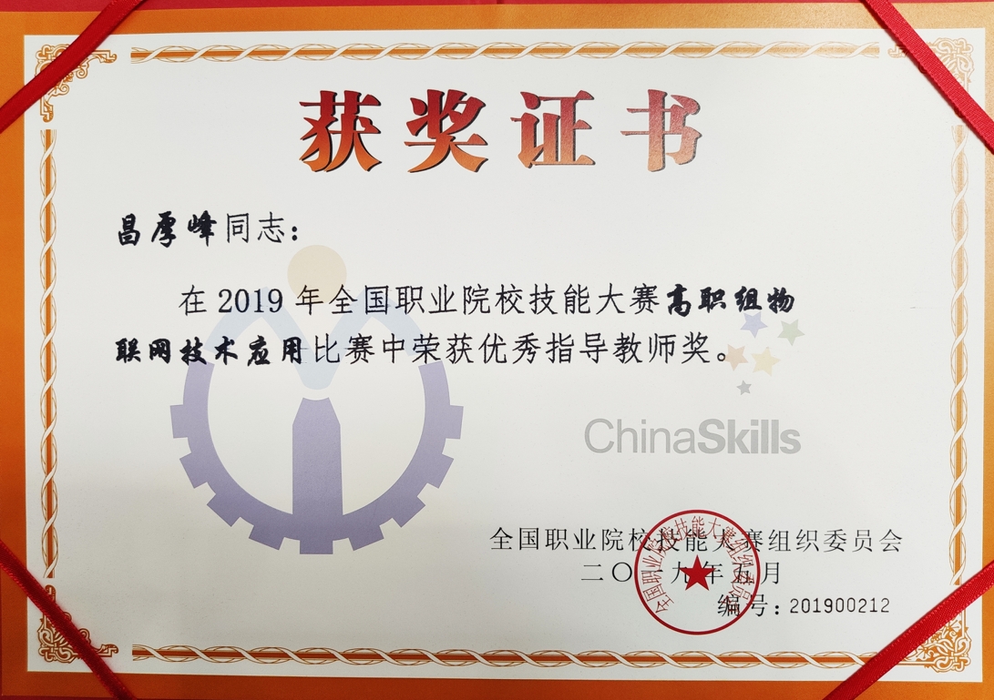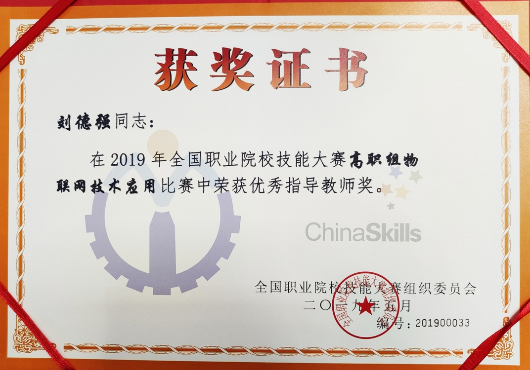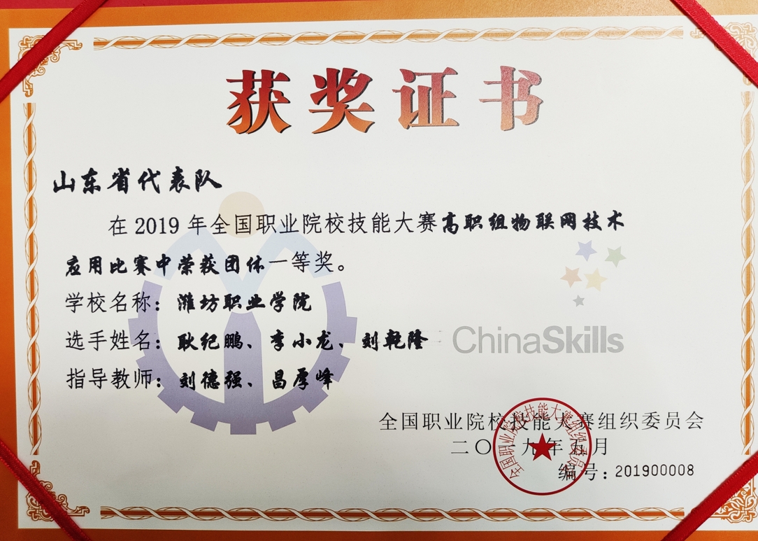 5月7日,2019年全国职业院校技能大赛高职组“物联网应用技术”赛项在天津中德应用技术大学举办,来自全国104个代表队参加角逐。beat365学生耿纪鹏、李小龙、刘乾隆组成的代表队,在指导教师团队刘德强、昌厚峰、焦国栋带领下以第一名的优异成绩获得团体一等奖,指导教师刘德强、昌厚峰获“优秀指导教师奖”。