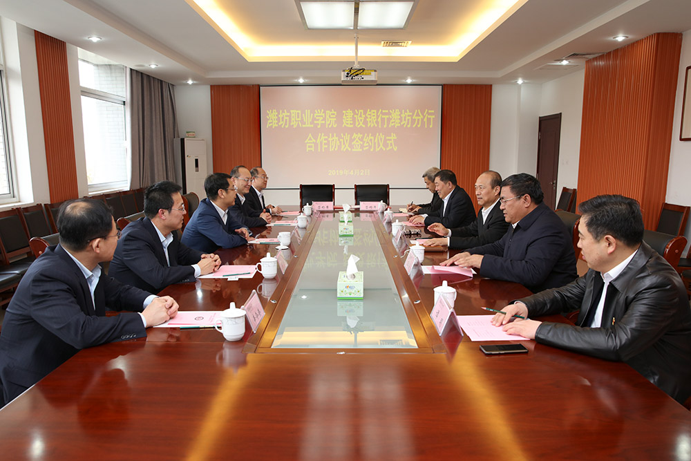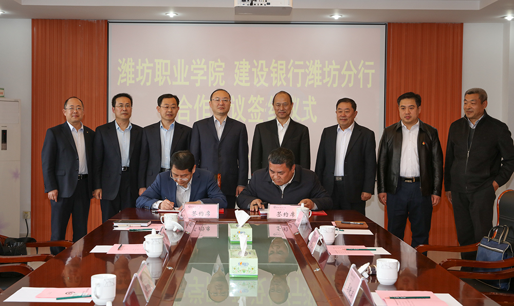 4月2日下午,学院与建设银行潍坊分行签署战略合作协议。建设银行潍坊分行党委书记、行长张健,副行长程刚,学院党委书记马跃启,院长王家爱,党委副书记宋桂言,党委委员、办公室主任谭明及双方相关部门负责人参加签约仪式。