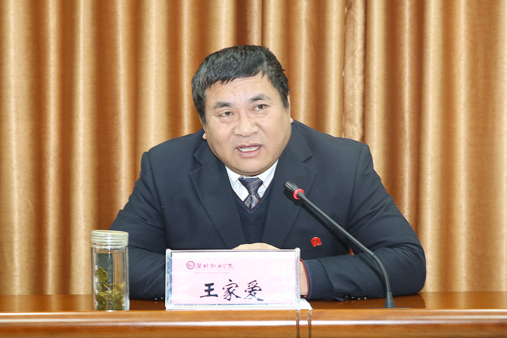 王家爱在讲话中提出做好2019年学院工作必须把握六个原则:坚持面向市场、服务发展、促进就业的办学方向;坚持内涵发展、特色发展、创新发展、开放发展的办学理念;坚持依法治校、依法治教的办学方略;坚持“抓党建,促创建”的工作主线;坚持“稳中求进”的工作基调;坚持问题导向、目标导向、成果导向。他从十个方面列出38项任务对2019年工作进行了重点部署:一是强化理论武装,更新教育理念,组织好干部读书班、教师培训班、优质校大讲堂,高标准完成上级调研课题。二是内部运行体制机制建设,根据市委巡察意见抓好整改落实,内部机构设置进行微调,统筹做好专业技术职务评聘和新教师招聘工作。三是办学经费使用和管理,尽快完成建设项目审计,推进闲置土地处置,共建共享面向企业社会筹措经费。四是基本建设和维修项目,启动体育馆和培训楼建设,抓好附设工程和维修项目。五是招生就业和学生管理,建立优质学校生源制度,扎实做好单招工作,提升就业质量,加强学生教育管理。六是教学与科研工作,全力做好省优质校验收,全力争取部分专业升为本科,抓好各级各类大赛参赛,做好各类教学改革试点,抓好科研平台和科技服务团队建设,抓好科技成果推广。七是产教融合与校企合作,抓好牵头职教集团工作,推进双元育人,搞好校企共建校外实训基地。八是校园信息化,完善校园网数据平台,投资建设专业规划实训室,加强教学信息化建设。九是办学国际化,抓好留学生教育,做好与刚果(金)、乌干达、巴基斯坦合作办学,积极申办与国外(境外)合作专业,筹备成立中德学院。十是校园文化与文明校园建设。抓好意识形态工作,加强媒体宣传弘扬新风正气,加强党风廉政建设,积极争创省级文明校园,加强校园综合治理,打造平安绿色生态和谐校园。