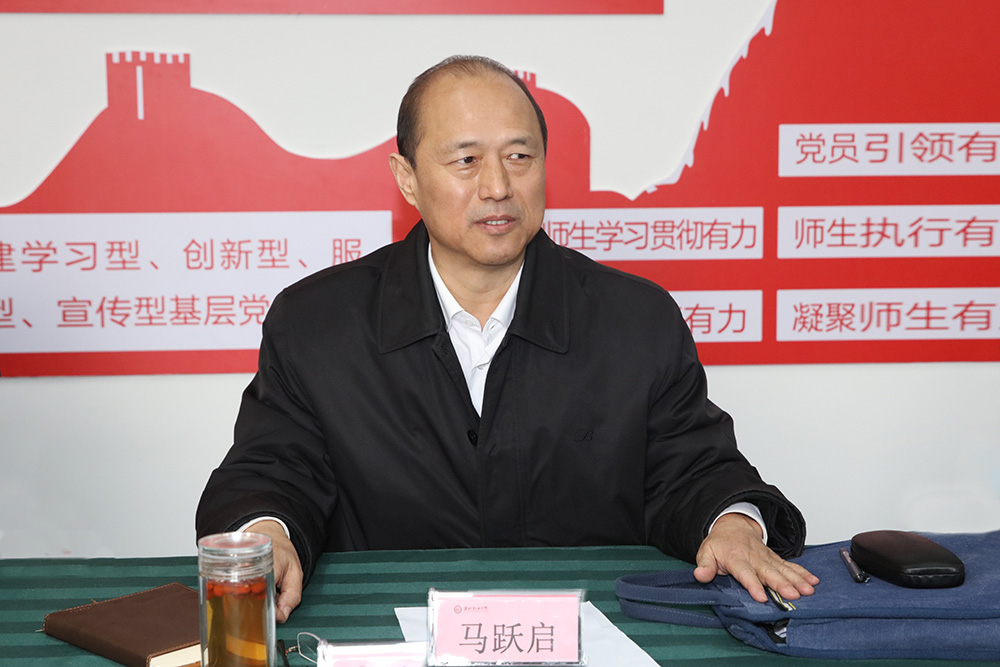 在思想政治理论课教学部,马跃启听取了专题学习汇报后指出,思政课教师更要以高标准要求增强政治意识,提高政治站位。要高度重视政治安全,牢固树立“四个意识”,坚定“四个自信”,坚决做到“两个维护”;要以身作则,为人师表,严以律己,发挥好表率作用,相互切磋,共同提高;要爱岗敬业,精益求精,充分发挥老中青教师所长,做到优势互补,实现资源共享,打造优良工作团队;要强化责任担当,推进工作落实。以扎实的工作作风谋划好新学期的各项工作,狠抓工作落实,团结实干、争创一流,弘扬钉钉子的精神,切实将各项工作抓实抓好。(鞠发营 臧学运 邢合理)