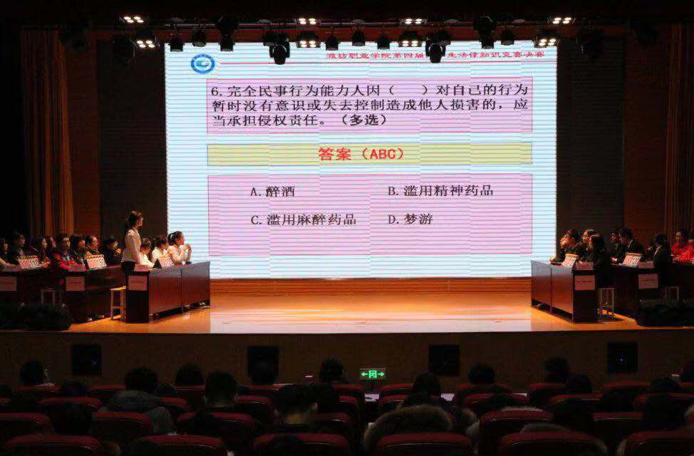在法律知识竞赛决赛中,各代表队在必答题环节,选手发挥稳定,比分呈现胶着状态。在抢答环节,既考查了同学们的反应速度,也考查了同学们知识掌握情况和综合应用情况,大家你追我赶、互不相让,比分逐渐拉开。在综合作答环节,选手正常发挥,比分差距变化不大。在最后风险题环节,各代表队求胜欲望强烈,出现多个代表队选最高分50分的风险题,导致险象环生,代表队的分数也经历了过山车般的大起大落,将竞赛推向高潮。计分间隙,大家一块观看了今年“12.2”道路交通安全日央视普法栏目报道的《生死六分钟》,让大家对道路交通中二次事故的危害与预防有了更加清醒的认识。比赛期间,周娉、马臻臻、王梅三位法学专业老师对每位选手的作答都给予了精彩点评,知道了考题作答的来龙去脉,收获了满满的获得感。