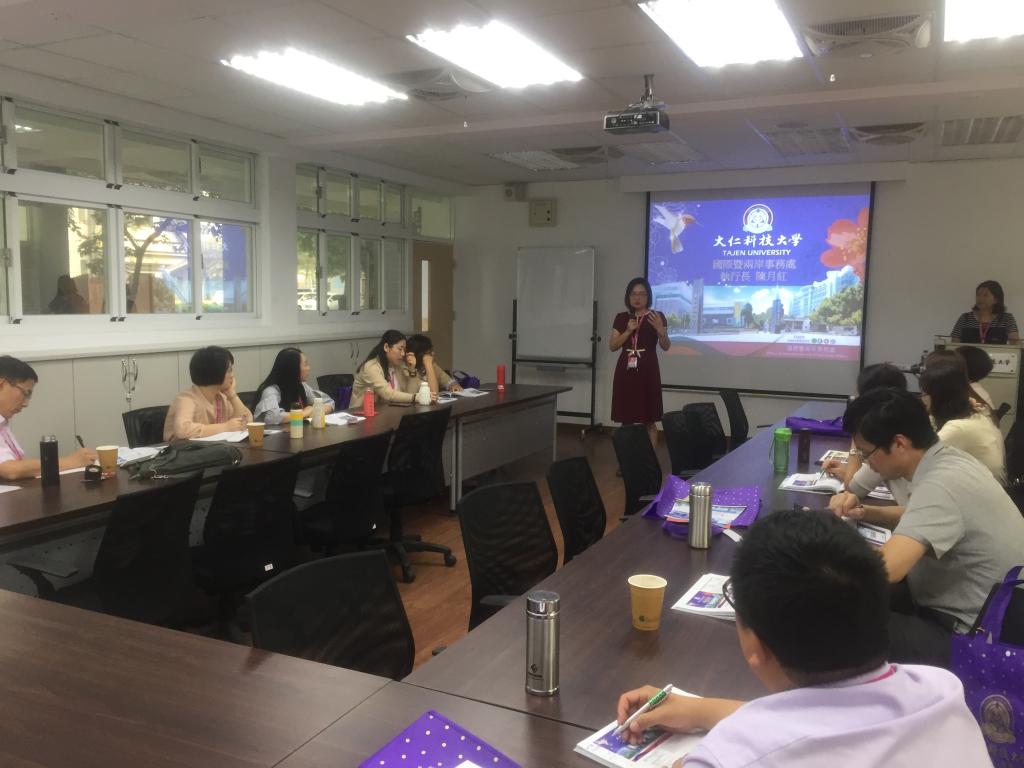 大仁科技大学是beat365多年的友好合作学校,是台湾科学技术类大学的典型代表。本次研修中,大仁科技大学给予了热情接待和周到安排,举行了欢迎仪式和交流座谈会。大仁科技大学副校长郭代璜致欢迎词,双方代表分别介绍了学校基本情况、办学特色、专业设置、师资情况以及所取得的丰硕成果。
