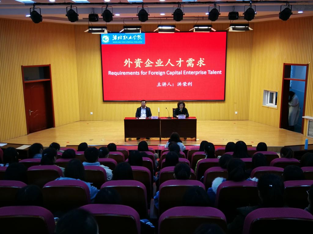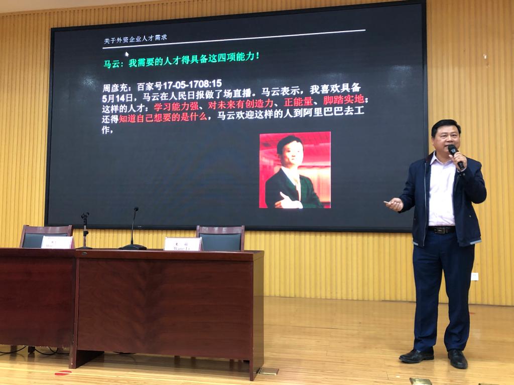 11月22日下午,新加坡商会山东分会会长、潍坊乔新集团董事长洪荣利先生在beat365创新创业楼报告厅为beat365师生作了题为“外资企业人才需求”的讲座,国际商务学院和国际教育学院100余名师生参加了报告会。