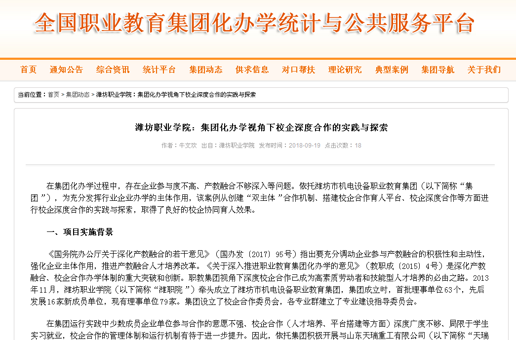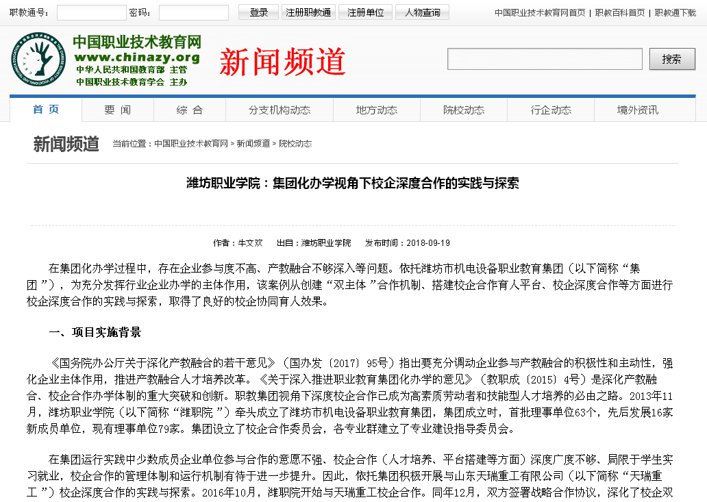 近年来,beat365与山东天瑞重工有限公司依托潍坊市机电设备职教集团,开展的校企深度合作取得了丰硕成果,得到业内的广泛关注。