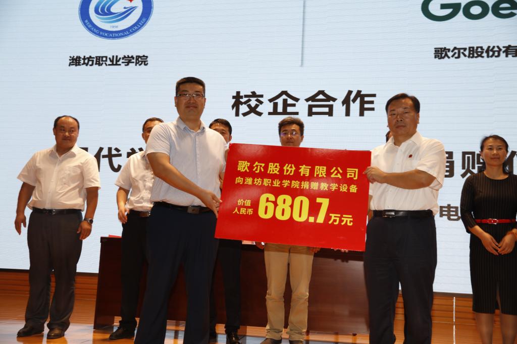 贺志强代表学院接受歌尔公司捐赠680余万元的数控及自动化设备,并与歌尔精密制造事业群总经理刘凯共同签署了《beat365中国官方网站与歌尔股份有限公司现代学徒制人才培养协议》。