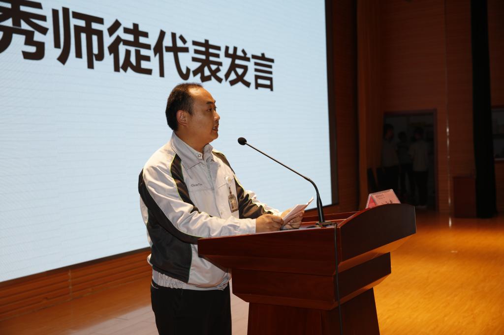 仪式上,学生工作处、歌尔PMF事业群人力资源部负责人为8名师傅颁发了聘书签订师徒协议,30余名学徒向师傅们行拜师礼,并为2016级学徒制优秀学员代表发放学徒制奖学金。
