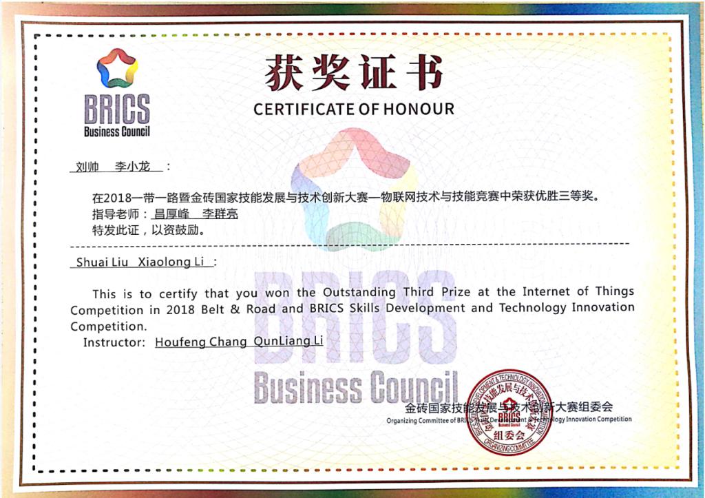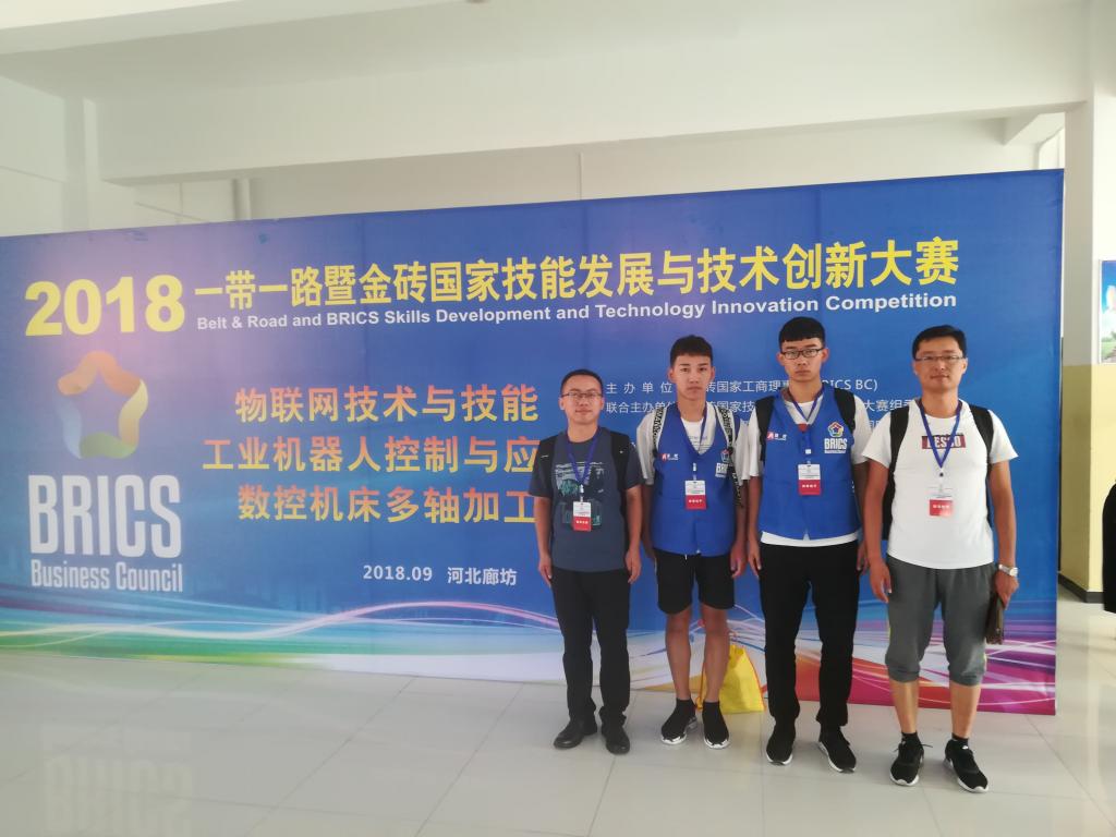 9月4日—8日,“一带一路”暨金砖国家技能发展与技术创新大赛闭幕赛——物联网技术与技能赛项中国赛区决赛在河北廊坊职业技术学院举办,此次决赛共有来自全国各地的20余支队伍参赛。beat365信息工程学院学生刘帅、李小龙,指导教师李群亮、昌厚峰,经过两个月的积极备战,克服困难,自制模拟软件与设备认真训练,最终在比赛中获得三等奖。