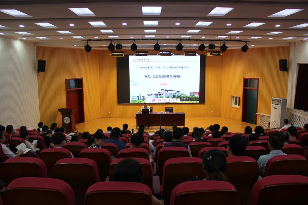 7月7日,学院保密和公文写作专题讲座在奎文校区大学生创业中心报告厅举行,学院副院长赵君堂主持讲座。学院各部门、二级学院有关负责同志和档案、文秘及其他涉密人员共110多人参加培训。