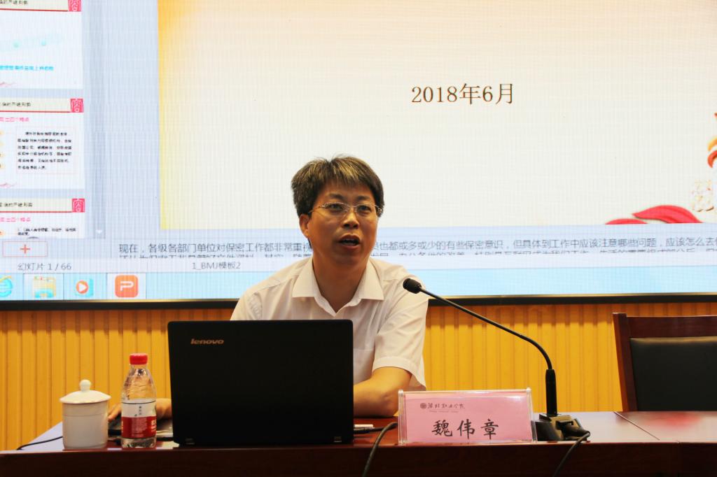 潍坊市保密局副局长魏伟章同志作题为《增强保密意识,掌握保密常识,努力提高做好保密工作的能力》的讲座。他客观分析了我国保密工作的严峻形势。当前敌对势力针对我国的窃密案件高发,并呈现出“主体更加多元、领域不断扩大、方式更加多样、技术更加先进”的特点,为此,必须充分认识做好保密工作的重要意义。他还分析了当前保密工作的认识误区,并指出了当前保密工作的突出问题及表现,一是毫无警惕、松懈麻痹,二是不懂不会、无知无畏,三是有章不循、有令不行,四是内外不分、禁门大开。最后,他重点讲解了加强保密工作的思路措施。要认真贯彻落实党的十九大精神及上级党委政府有关要求,要树立忧患、忠诚、责任、内外有别、违纪即问责等五种意识,要按照“八要”“八不得”要求,全面落实党和国家保密工作法律法规、保密工作领导责任制,配齐配强保密工作机构力量,打好定密规范管理、网络保密管理、涉密人员管理“三大攻坚战”。讲座政策理论性强,案例剖析深刻,发人深省。