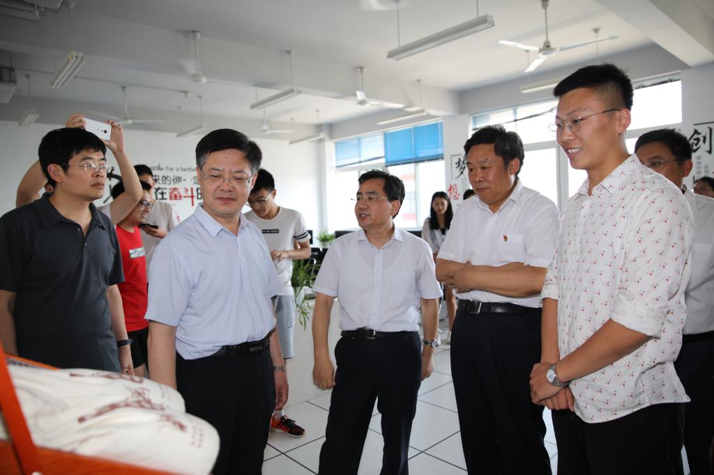 白皓一行现场考察了学院办学成果展及信息工程学院大学生创新创业中心,详细了解了学院滨海校区整体规划以及学院在教学、科研、技能大赛、学生培养、对外合作交流等方面取得的成果,认真听取了关于大学生创新创业情况汇报,并与大学生创新创业中心的学生进行了亲切交流。