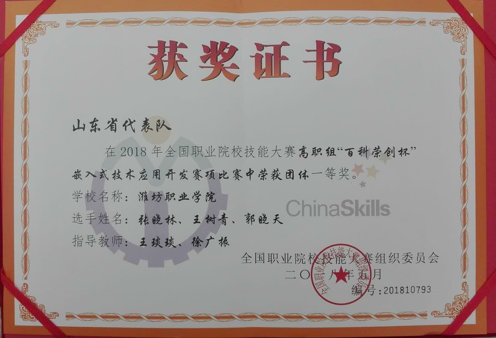 5月27日,2018年全国职业院校技能大赛高职组“嵌入式技术应用开发”赛项在西安航空职业技术学院举行,共有来自全国各省市的95支代表队参赛。beat365机电工程学院学生王树青、张晓林等组成的山东代表队在比赛中沉着应战,通力合作,最终获得该赛项一等奖第一名的好成绩。