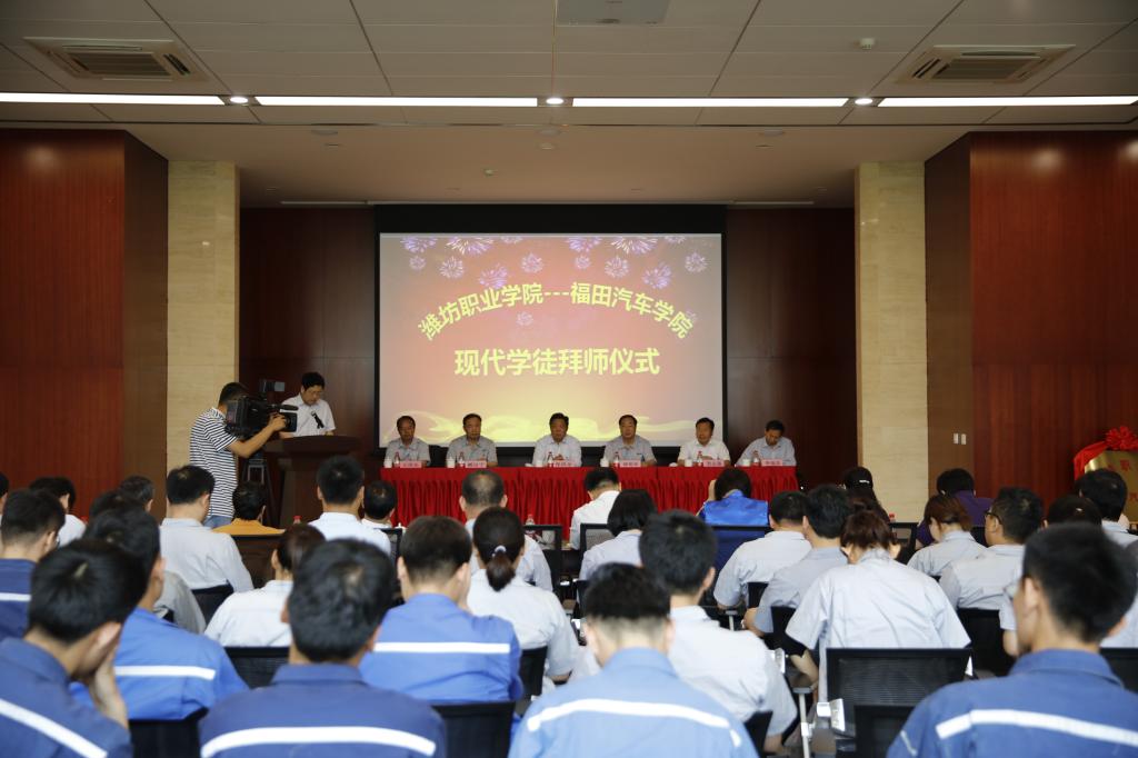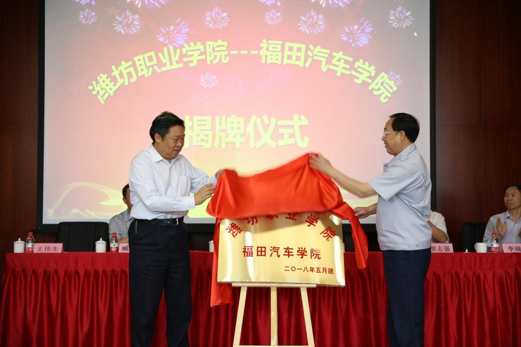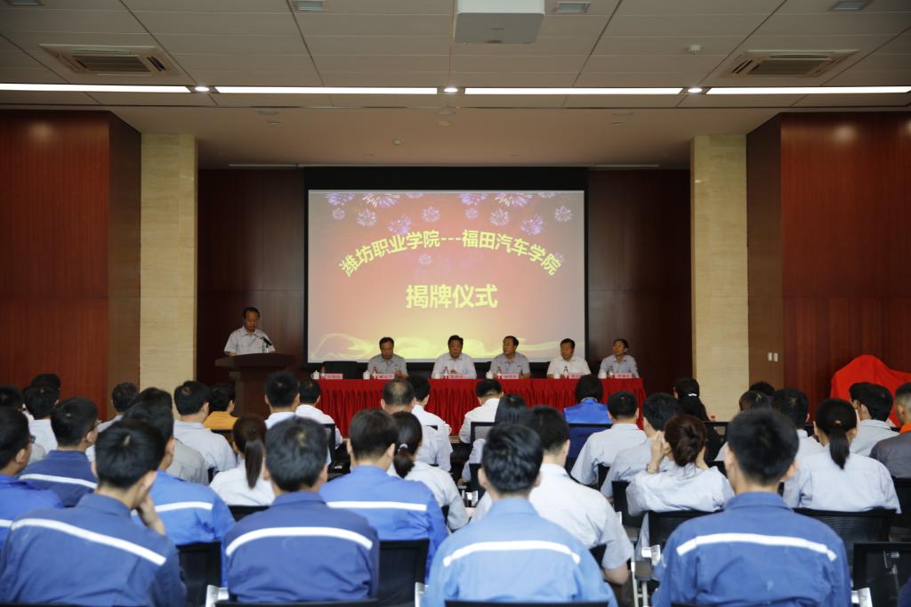 5月25日上午,beat365中国官方网站福田汽车学院成立仪式在福田多功能汽车厂潍坊厂区学术报告厅举行。学院党委书记张洪全,福田商用车集团副总裁钟明华,学院副院长贺志强、李瑞昌,福田多功能汽车厂潍坊厂区党委书记臧运宁等校企领导、学院相关职能部门、二级学院负责人及学院学生代表、企业职工代表参加了成立仪式。张洪全与钟明华共同为beat365中国官方网站福田汽车学院揭牌。福田潍坊厂区党委常务副书记王伟先主持仪式。