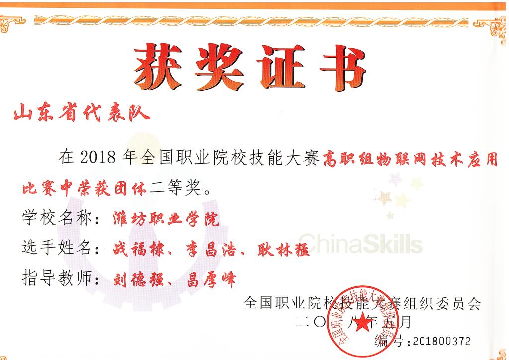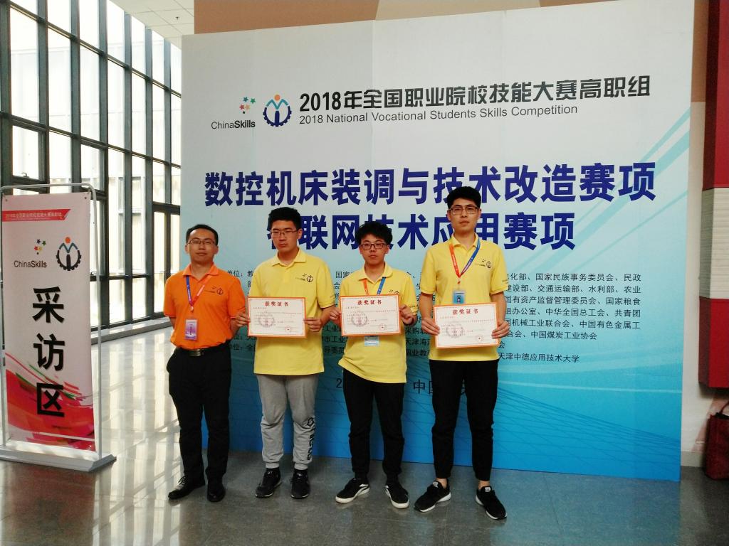 5月8日,2018年全国职业院校技能大赛——高职组“物联网技术应用”赛项在天津中德应用技术大学拉开序幕。本次比赛共有来自全国各地职业院校的103个代表队同台竞技,经过4小时的激烈角逐,我校信息工程学院选派学生战福棣、李昌浩、耿林猛,在指导教师刘德强、昌厚峰的带领下,代表山东队获得团体二等奖。