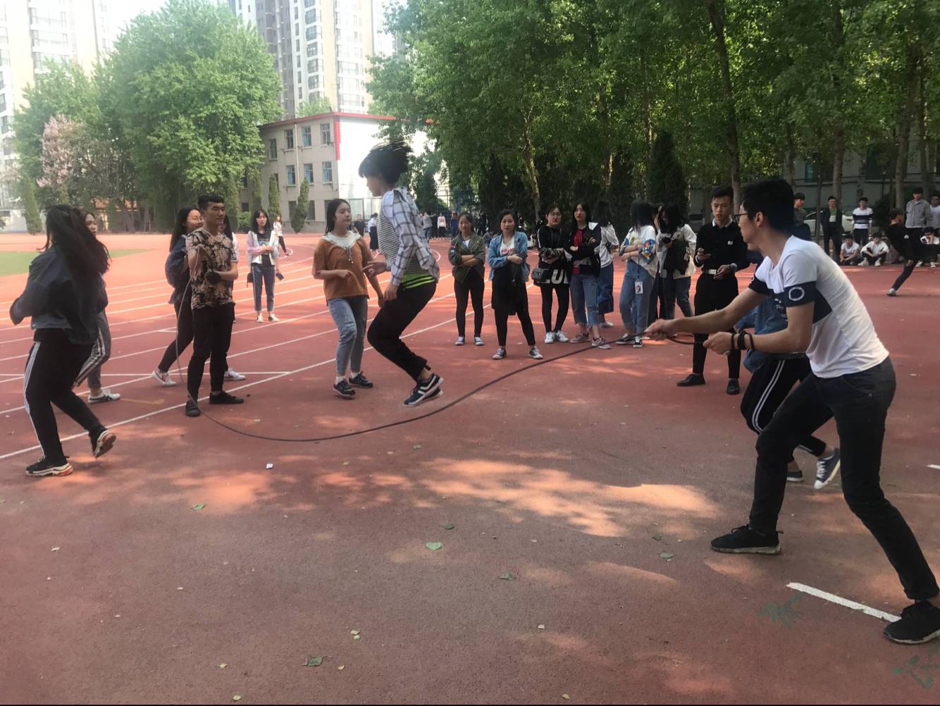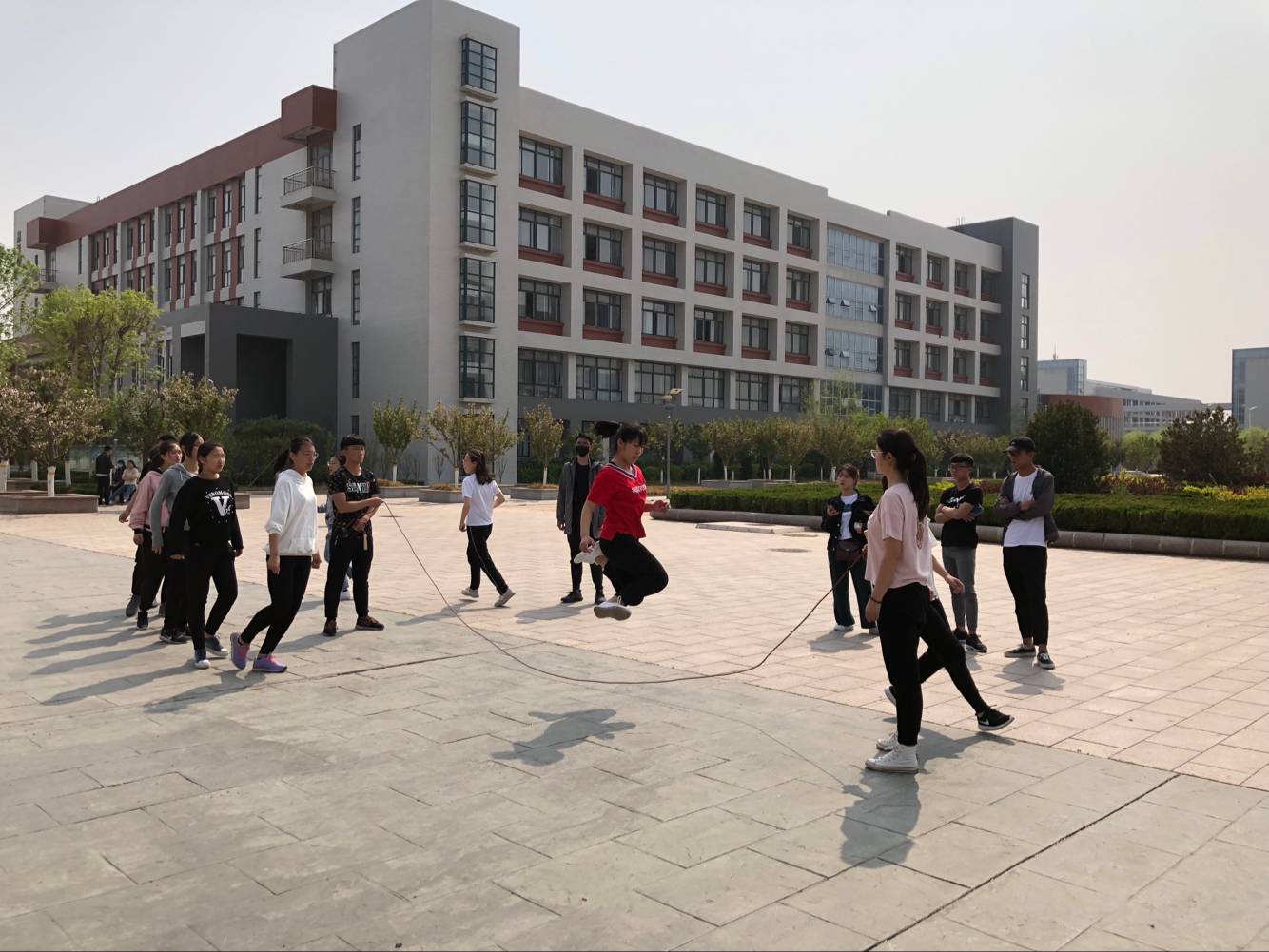 4月26日下午,学院首届跳大绳比赛分别在滨海校区图书馆楼前和奎文校区运动场两个赛场同时举行。