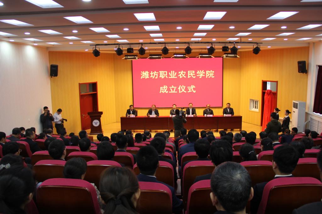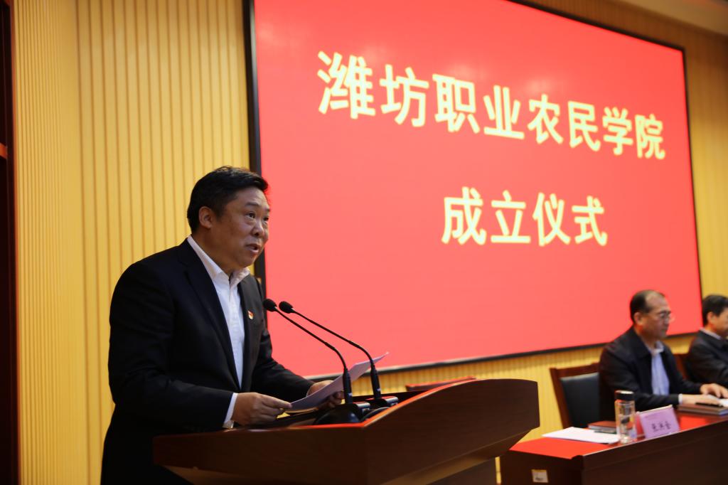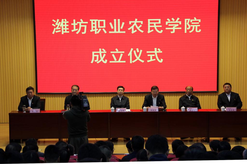 4月16日上午,潍坊职业农民学院成立仪式在学院奎文校区隆重举行。潍坊市委副书记、市长李宽端出席仪式并与党的十九大代表、寿光市三元朱村党支部书记王乐义一起为潍坊职业农民学院揭牌。市委常委、组织部部长林红玉主持仪式,副市长马清民讲话,学院党委书记张洪全、院长王家爱出席,市直相关部门、学院领导以及部分涉农企业、兄弟院校主要负责同志,beat365中层干部及师生代表140余人参加仪式。
