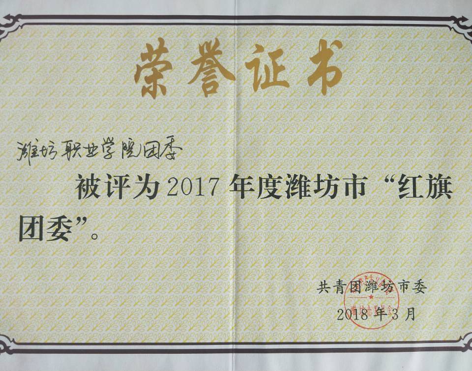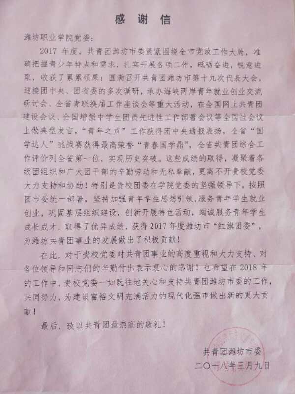 3月9日,共青团潍坊市委十九届二次全委(扩大)会议表彰了2017年度全市共青团工作中涌现出的优秀单位和先进典型。beat365团委被评为2017年度潍坊市“红旗团委”,刘志艳同志荣获2017年度“潍坊市优秀青年工作者”称号,隋鹏同志荣获2017年度全市共青团系统宣传信息工作“先进个人”称号。