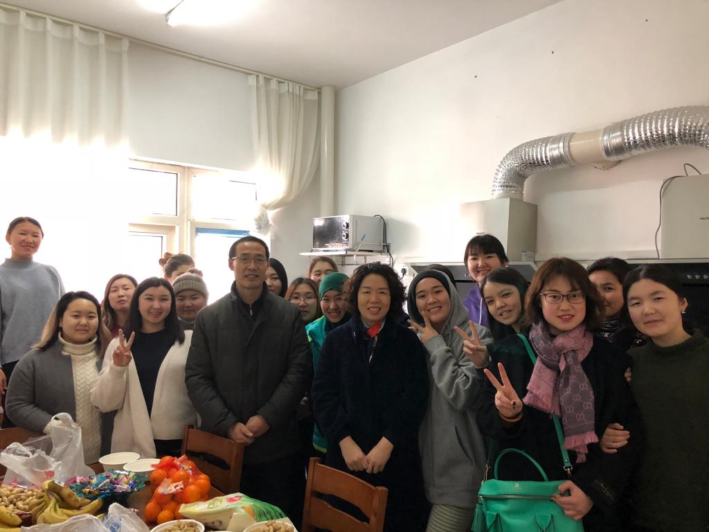 赵君堂和老师们为留学生们带来了新鲜可口的水果、缤纷甜美的糖瓜花生以及春节必吃的饺子。赵君堂向同学们介绍了中国春节及风俗习惯,教大家如何用汉语问候新年,询问同学们假期学习和生活情况,同时为留学生们及其家人送上了亲切而又温暖的祝福,并叮嘱留学生们好好学习、注意假期留校期间安全问题,过一个平安、祥和的春节。