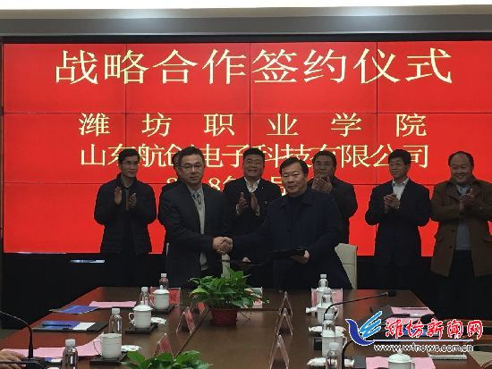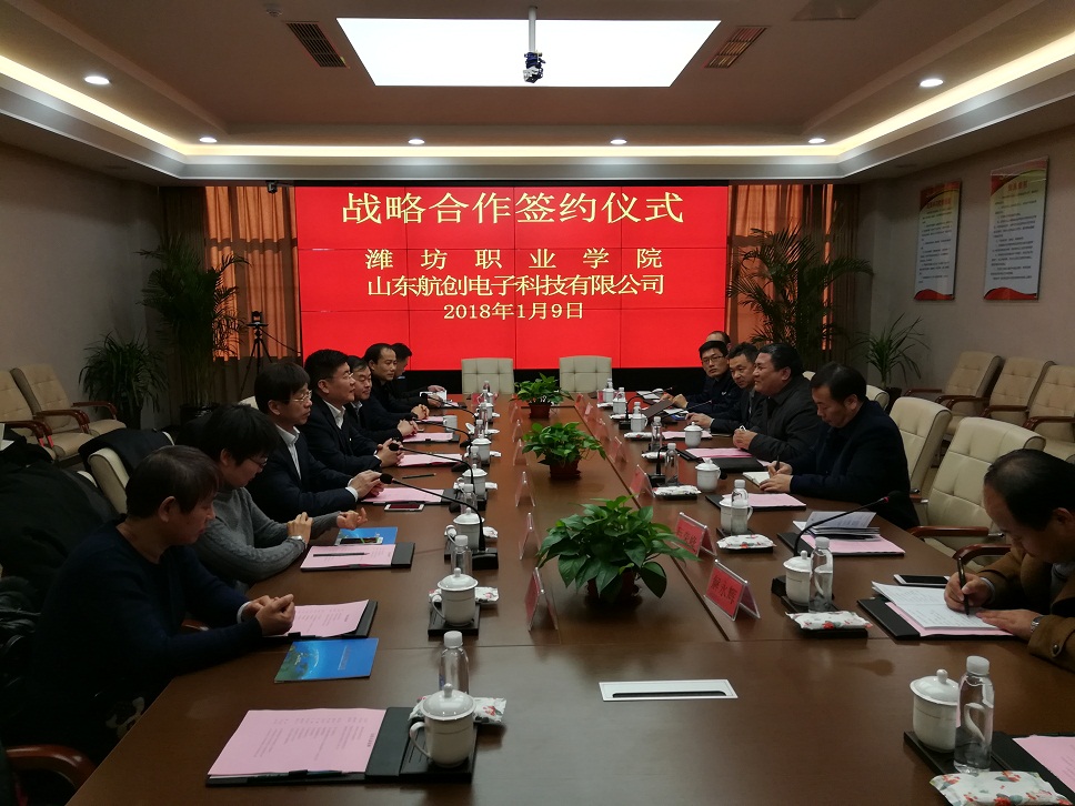 贺志强与山东航创电子科技有限公司董事长梁旭代表校企双方正式签署战略合作协议。双方将在专业共建、师资队伍共建、产学研合作、学生实习就业等方面加强合作。先期将共同组建“无人机应用技术”订单班、共建“山东航创无人机组装实训室”,后期将推进混合所有制二级学院建设。