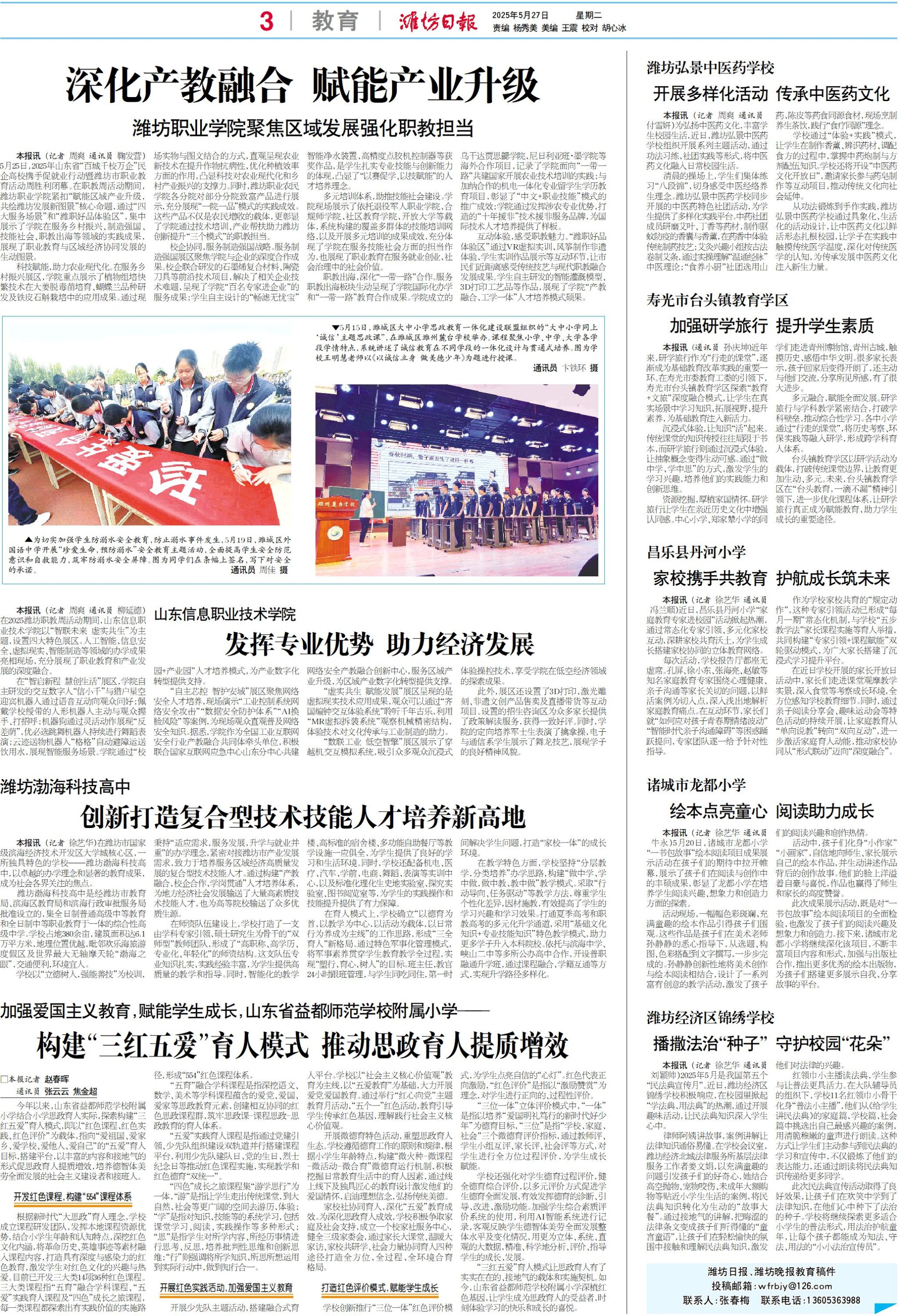 本报讯 (记者 周爽 通讯员 鞠发营)5月25日,2025年山东省“百城千校万企”民企高校携手促就业行动暨潍坊市职业教育活动周胜利闭幕。在职教周活动期间,beat365中国官方网站紧扣“赋能区域产业升级,共绘潍坊发展新图景”核心命题,通过“四大服务场景”和“潍职好品体验区”,集中展示了学院在服务乡村振兴、制造强国、技能社会、职教出海等领域的实践成果,展现了职业教育与区域经济协同发展的生动图景。