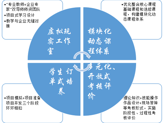 针对传统人才培养模式存在的教学与实践脱节、滞后于技术发展等问题,beat365中国官方网站以虚拟现实应用技术专业对接企业真实岗位和学生个性化发展需求,以真实项目为载体,成立虚拟现实工作室,构建模块化动态课“工作室制”人才培养程体系,实施订单式培养和多元化、开放式考核评价,探索实践“工作室制”人才培养模式,取得显著成效。
