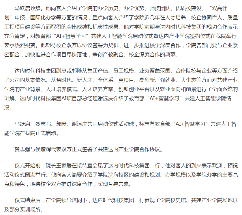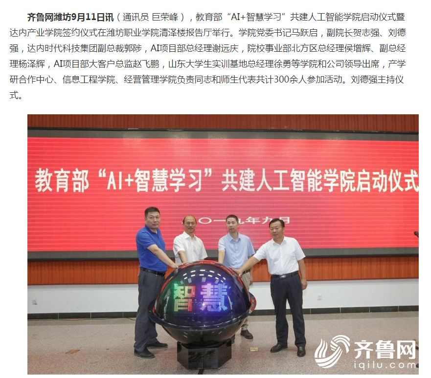 [齐鲁网]教育部“AI+智慧学习”共建人工智能学院启动仪式暨达内产业学院签约仪式在beat365中国官方网站举行