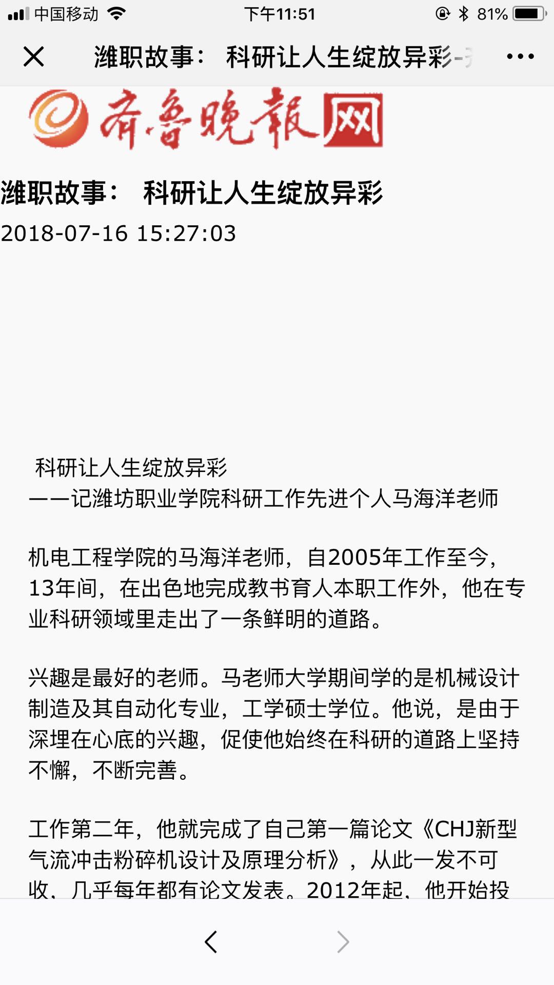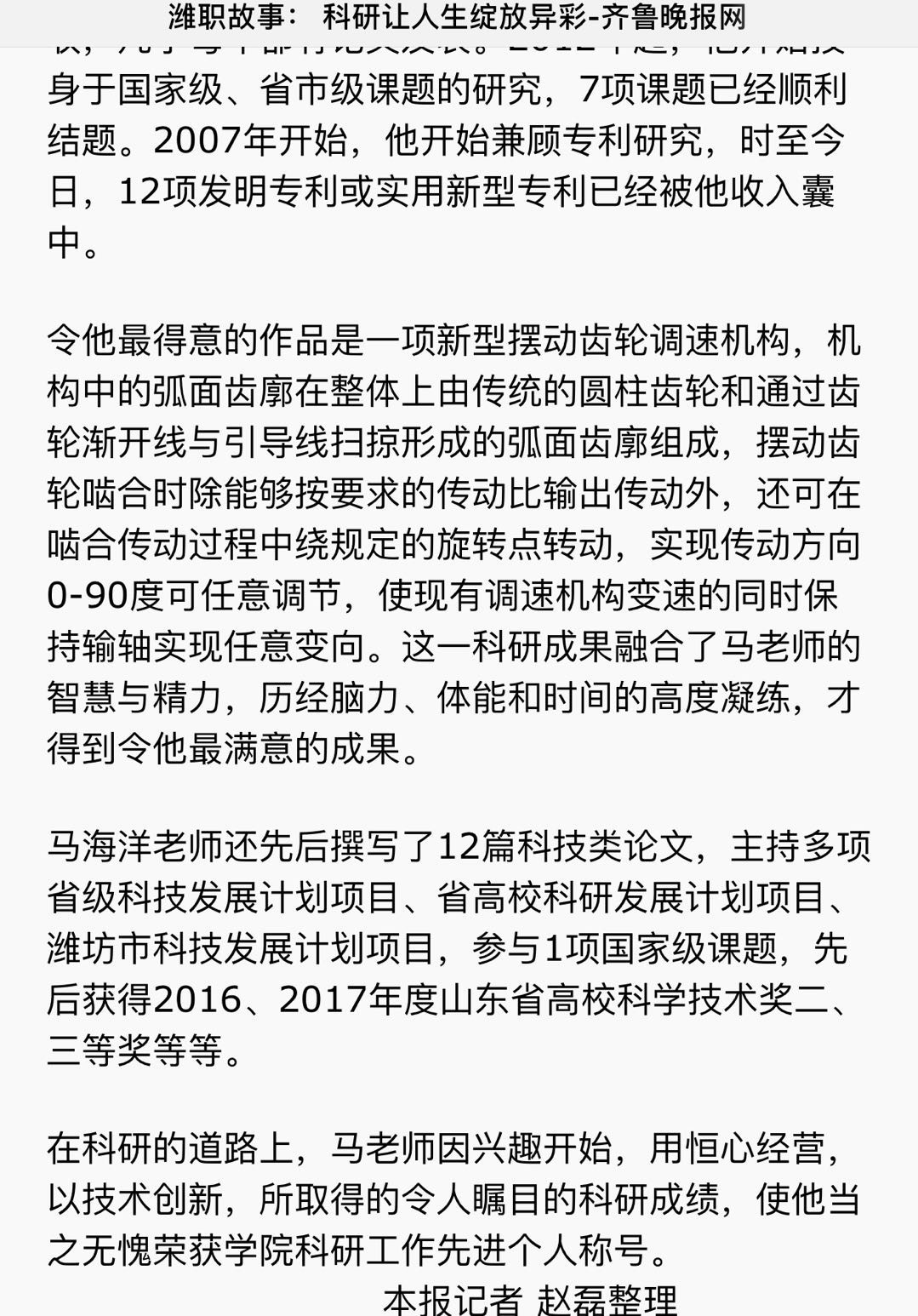 [齐鲁晚报]潍职故事:科研让人生绽放异彩——记beat365科研工作先进个人马海洋老师