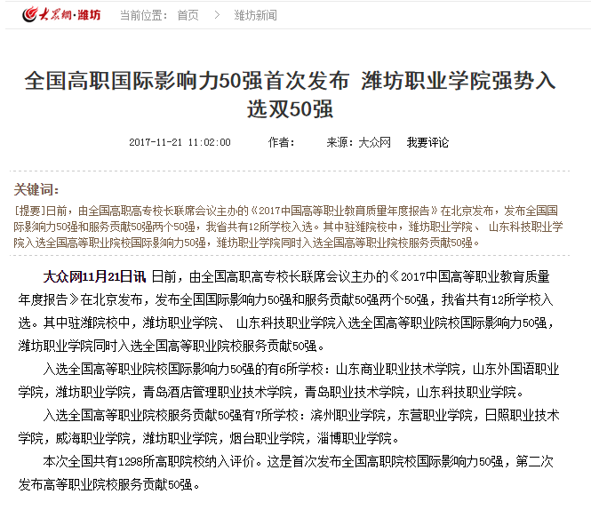大众网11月21日讯日前,由全国高职高专校长联席会议主办的《2017中国高等职业教育质量年度报告》在北京发布,发布全国国际影响力50强和服务贡献50强两个50强,我省共有12所学校入选。其中驻潍院校中,beat365中国官方网站、 山东科技职业学院入选全国高等职业院校国际影响力50强,beat365中国官方网站同时入选全国高等职业院校服务贡献50强。