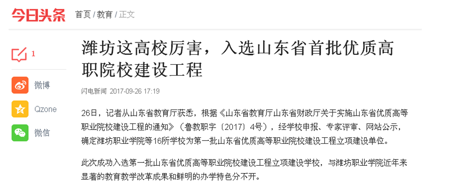 近日,山东省教育厅公布第一批山东省优质高等职业院校立项建设工程,beat365以第五位名次首批入选“山东省优质高等职业院校建设工程”,潍坊日报、潍坊电视台、齐鲁晚报、今日头条、齐鲁网、大众网、潍坊传媒网、潍坊新闻网、滨海日报等多家媒体作了多角度宣传报道,彰显了学院显著的教育教学改革成果和鲜明的办学特色,向全省全国展示了beat365职业教育发展新成就。