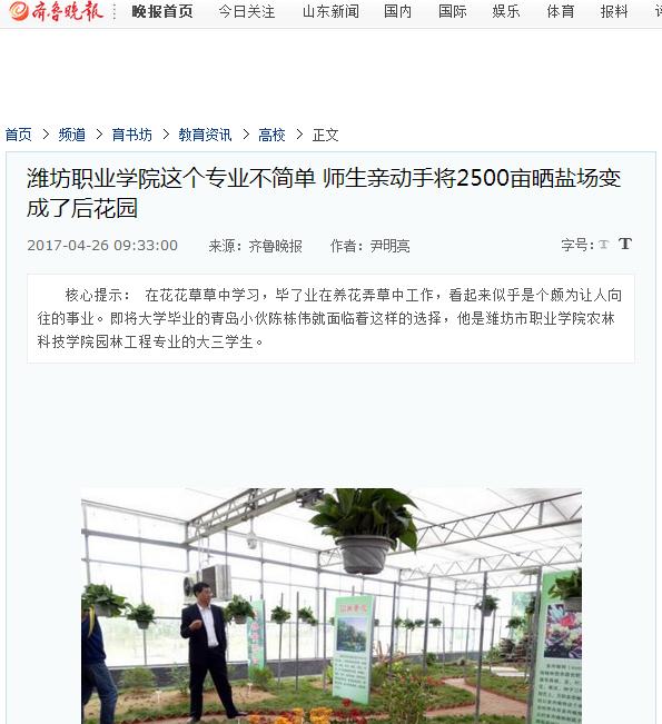 潍坊4月26日讯在花花草草中学习,毕了业在养花弄草中工作,看起来似乎是个颇为让人向往的事业。即将大学毕业的青岛小伙陈栋伟就面临着这样的选择,他是潍坊市职业学院农林科技学院园林工程专业的大三学生。在这个位于渤海之滨的职业学院,陈栋伟就读的这个农林科技学院可不简单。