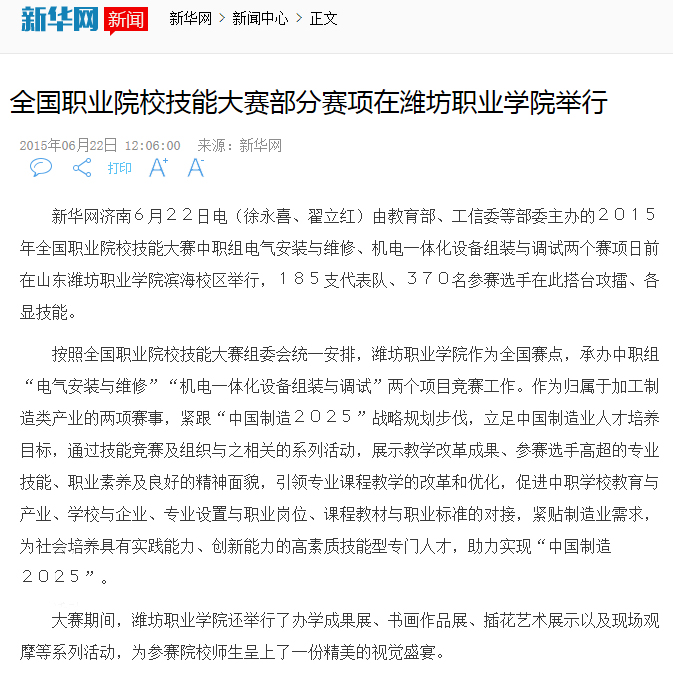 6月13日至15日,2015年全国职业院校技能大赛中职组电气安装与维修、机电一体化设备组装与调试两个赛项在beat365滨海校区举行。新华网作了报道,网易、人民网、央广网、中国网、中国教育新闻网、腾讯网、中国台湾网等多家网站转载。
