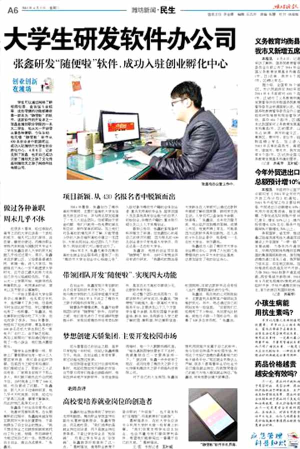 学生可以通过网络了解校园街景、查询饭卡余额等,这些便捷的功能都要依靠一款名为“随便啦”的软件。这款软件的开发者之一张鑫是beat365中国官方网站的一名大二学生,他从大一开始便从事各种兼职。今年年初,他凭借“随便啦”软件从430名创业者中脱颖而出,成功入驻潍坊市大学生创业孵化中心。4月6日,记者见到了张鑫,他目前已成功注册了潍坊天之骄子文化传媒和潍坊天之骄子网络科技有限公司。