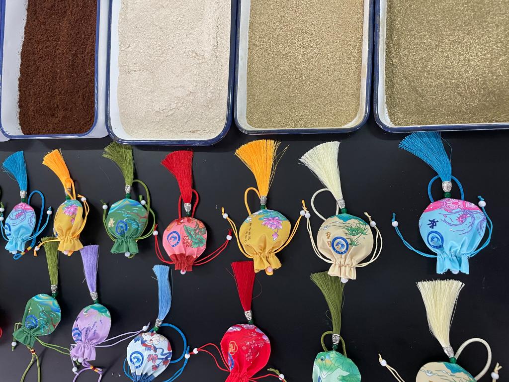 活动伊始,指导教师为学生讲解了中药香囊的起源与作用、本次香囊的药物组成及功效,带领同学们一同领略中医药香的浩瀚,让大家对端午传统文化和中医药知识有了深入了解。香囊配料中多选用艾草、薄荷、藿香、白芷、丁香等芳香性药物,发挥醒神开窍、疏风解暑、驱蚊防疫等功效。在老师的指导下,学生们积极参与香囊的制作过程,大家分工合作,整理药草,计算配比,称重粉药,填充香囊,一个个饱含“平安、健康、吉祥”等美好愿望的香囊制作完成。