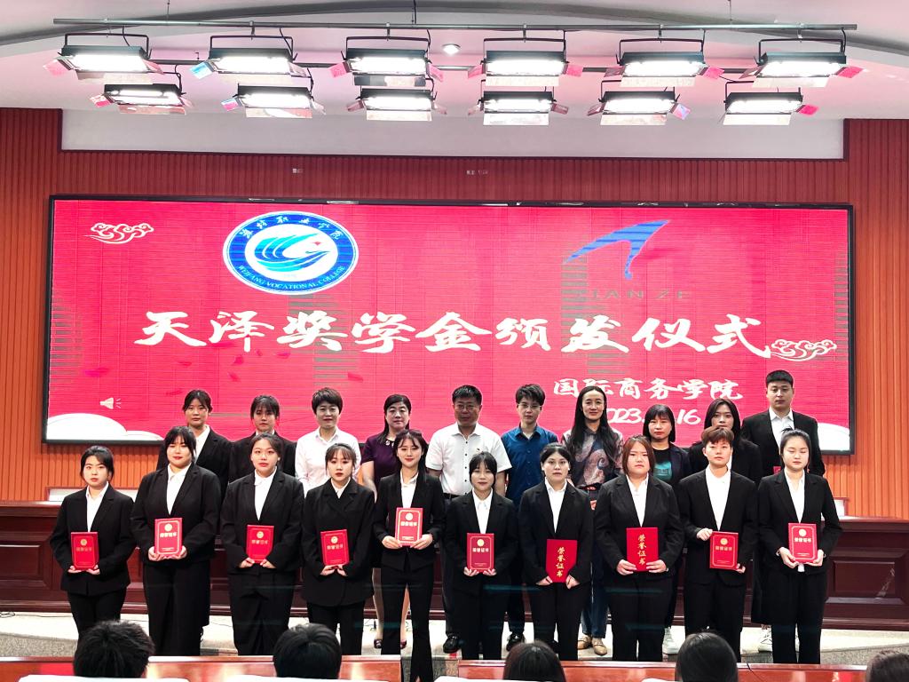 为深入贯彻落实全国高校思想政治工作会议精神,围绕学生、关照学生、服务学生,激励学生健康成长成才,树立先进典型,发挥示范引领作用。5月16日,国际商务学院天泽集团校企合作班2021-2022年度奖学金颁奖仪式在清泽楼报告厅举行。该院党总支负责同志、校企合作办公室负责人、团总支负责人、辅导员、天泽集团相关负责人及2022、2021级“天泽班”的学生参加了此次活动。