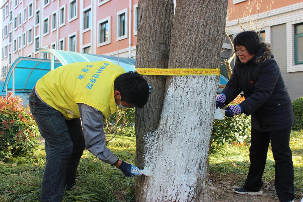 随着冬季气温的逐渐降低,为增强社区树木抗寒、防冻、防虫能力,保障树木的良好生长态势,确保社区植物安全越冬,师生们对社区区内的法国梧桐、杨树、国槐等树木进行越冬涂白工作,包括社区主干道两侧以及院墙外围树木等。
