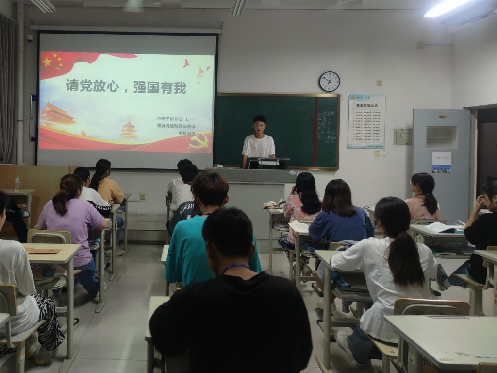 本次活动形式多样,内容丰富,主要围绕“请党放心,强国有我”主题开展主题团课,进行学习讨论,发表感悟等等。在主题团课上,同学们重温了建党100周年大会和习近平总书记讲话,回顾革命先烈的光荣事迹,感受如今新中国的繁荣强盛。观看视频后同学们进行了热烈的讨论,纷纷发表感悟,青年是祖国的希望,青年强则国强,在未来的进程中,每个人都是不可缺少的一份子。同学们铿锵有力、激情饱满的喊出“请党放心,强国有我”!这是青年们对党的庄严承诺。