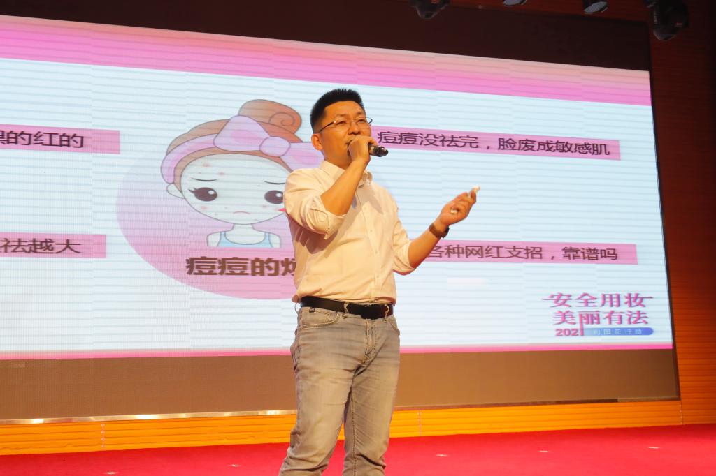 全国化妆品安全科普宣传周活动今年首次设立科普进高校活动,科普内容以国家药品监督管理局确定的宣传要点为核心,重点提高在校大学生安全用妆和科学用妆意识,同时对化妆品行业新法规进行宣传。讲座紧扣安全用妆、美丽有法的活动主题,引导学生护肤应该以科学为导向,提高科学护肤、安全护肤、理性护肤意识。