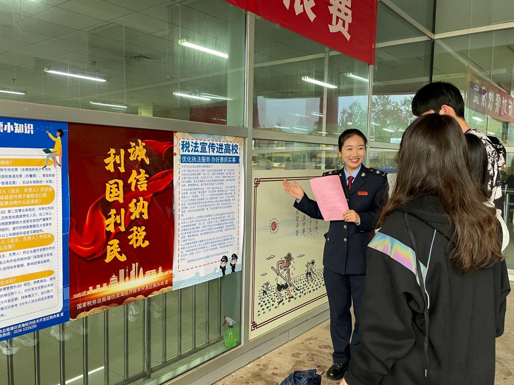 开展税法宣传,让老师和在校大学生了解税法、学习税法、遵守税法,增强依法纳税意识。今后财务处将继续加强与当地税务部门的合作,开展多种主题鲜明、内容丰富、形式新颖的税收宣传活动,将税法普法教育常态化,于细微处宣讲税收知识,提高师生的税法知晓率和遵从度。(王素霞供稿)