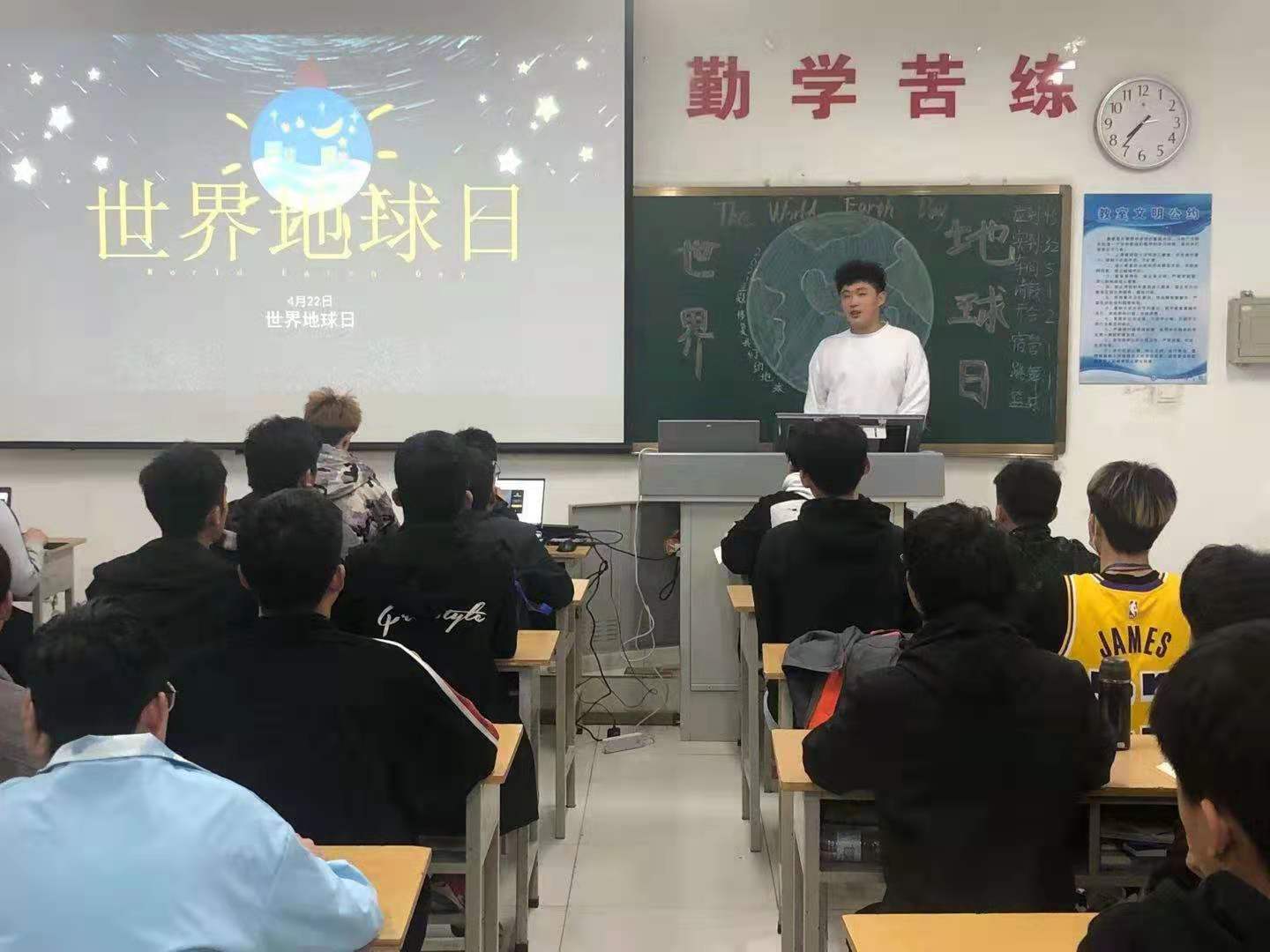 各班以团支部为单位召开世界地球日主题团课。普及地球科学知识、环保法律法规,并发出倡议“从自身做起,从小事做起,牢固树立绿色低碳意识,坚决抵制资源浪费情况”,得到了同学们积极响应。各班级通过制作班级黑板报,积极宣传环保理念。同学们自发组成志愿服务队伍分不同路线对校园进行了捡拾清扫,积极践行垃圾分类,美化了校园环境。