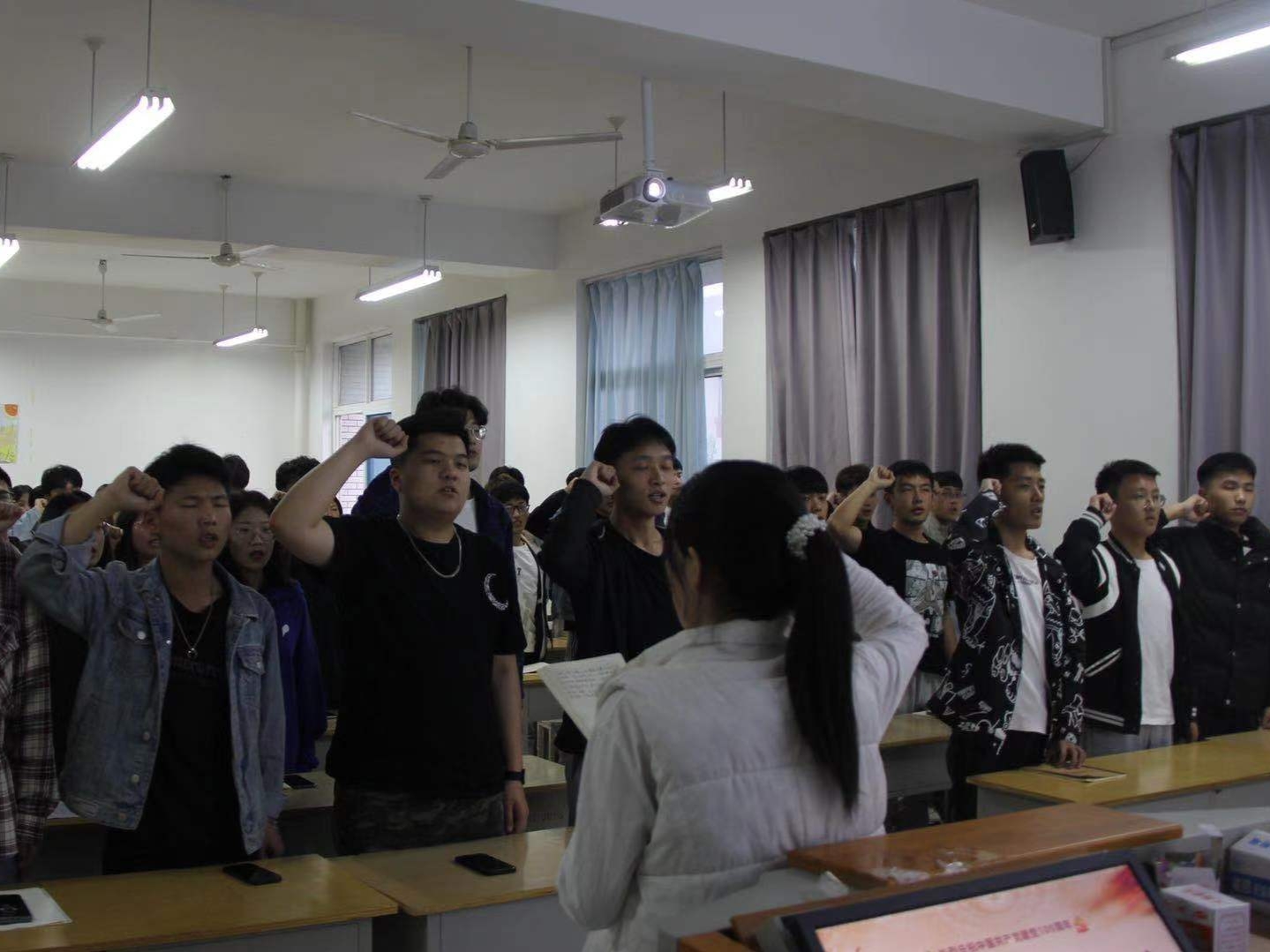 此次主题团日活动分为升旗仪式、主题团课、班级交流三个部分,信息工程学院全体在校生共同参加。早上,全体同学齐聚操场,共同参加庄严的升旗仪式。伴随着雄壮的国歌,五星红旗冉冉升起,辅导员老师和学生代表分别进行了演讲,向同学们讲述了中国共产党的百年奋斗历程,告诉同学们新时代青年大学生正逢其时,应当不忘初心、刻苦学习、不懈奋斗,为党和国家的发展贡献力量。下午,各班级在负责人的带领下开展主题团课,让同学们在学党史中汲取营养、获取力量,增强了爱党爱国信念。晚上,同学们展开班级交流,分享党史学习感悟与心得,并进行了庄严宣誓。
