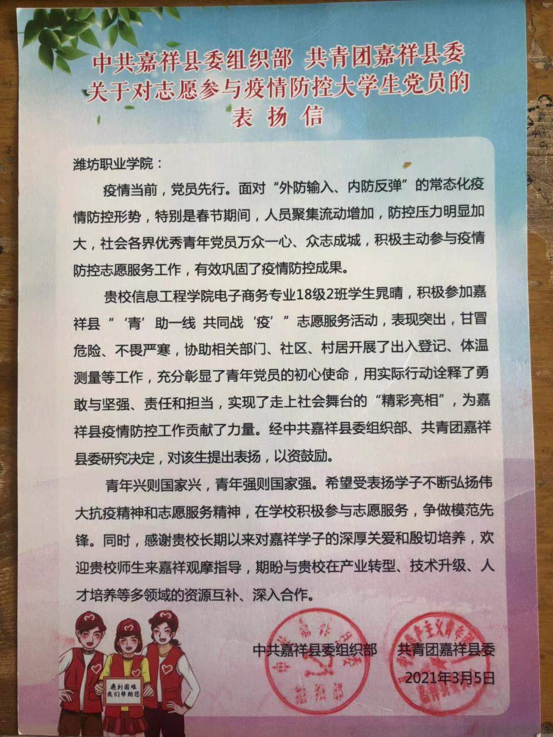 近日,信息工程学院团总支收到中共嘉祥县委组织部、共青团嘉祥县委送来的一封感谢信,感谢beat3652018级电子商务2班晁晴同学在春节期间积极主动参加疫情防控志愿服务工作。一封感谢信,不仅是潍职学子在用实际行动诠释勇敢与坚强、责任与担当,更是“崇实尚行 敢于争先”潍职精神的体现。