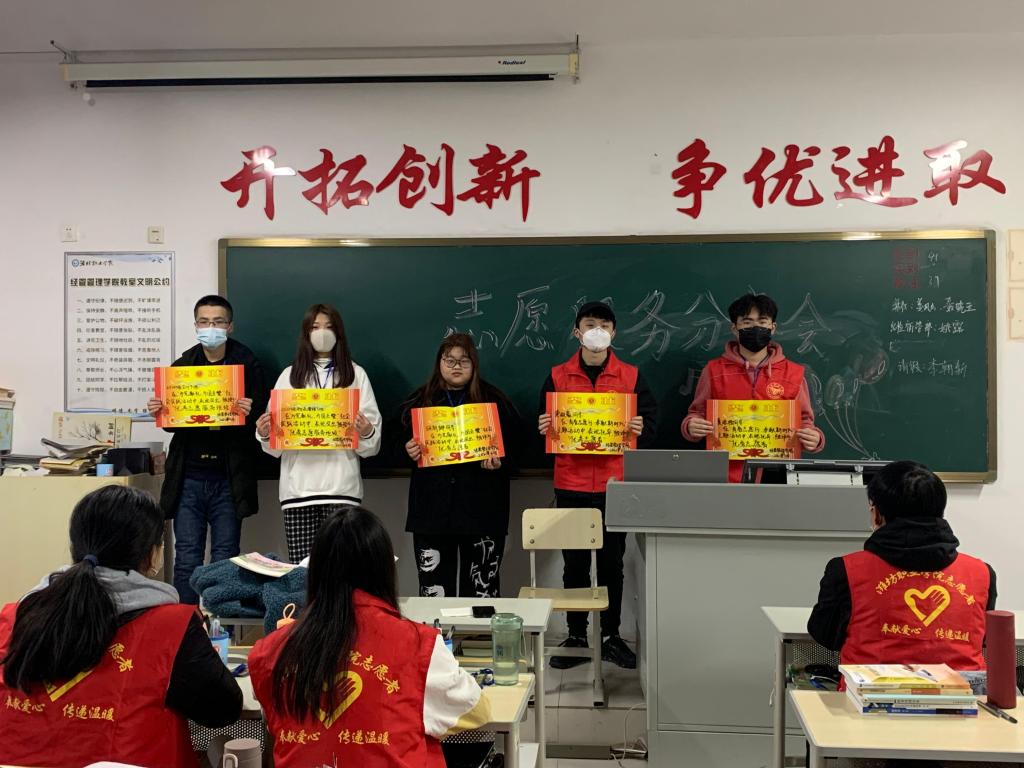志愿服务活动中,各班级紧紧围绕“青春志愿行·奉献新时代”学雷锋主题,通过精讲团课、分享交流重温雷锋精神,开展形式多样的志愿服务活动。各班团支书通过照片、视频、优秀青年志愿者典型事迹等召开主题团课,宣传雷锋先进事迹,崇尚雷锋高尚品德,感悟雷锋时代精神。随后,班内志愿者代表分别分享了在疫情期间作为志愿者的经历和感受。分享后,同学们围绕青年大学生如何学雷锋、做雷锋进行了热烈的讨论。同学们纷纷表示作为当代大学生,应该为中华民族的伟大复兴贡献自己的力量,像雷锋学习,让青春与志愿同行。课外活动时间,组织学生楼道执勤、打扫卫生、去餐厅收餐具、擦桌子等志愿服务活动。最后,学院团总支评选出在寒假社会实践活动和学雷锋志愿服务活动中表现突出的团队与个人进行表彰。