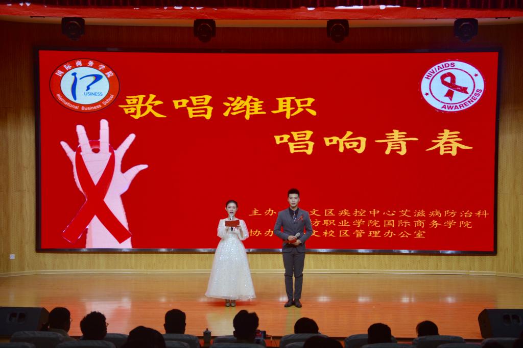 以线下为载体,借助文艺汇演提升活动品质。11月26日下午,以《飘动的红丝带》为开场的“歌唱潍职,唱响青春”文艺汇演暨防疫抗艾知识竞赛现场总决赛在奎文校区16号楼报告厅举行。奎文区疾控中心艾滋病防治科负责人、beat365中国官方网站医疗服务中心负责人、国际商务学院分管学生负责人、团总支书记及辅导员担任了评委。根据疫情防控常态化的要求,总决赛采用现场展示和网络直播的形式开展,国际商务学院线上线下共计一千余名师生观看了比赛。同学们以歌唱、朗诵、舞蹈等形式,展现了新时代大学生对防疫抗艾的认识和担当,以实际行动参与到防疫抗艾的活动中。