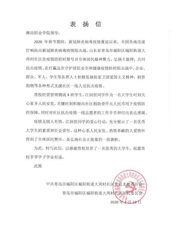 3月11日beat365收到来自中共青岛市城阳区城阳街道大周村社区一封特殊的表扬信,2019级物流管理四班江润世同学向社区疫情防控无偿捐款壹千元人民币。他捐款的数目虽不巨大,却承载了爱的力量。在同学们眼中,他是善于助人的好朋友,当同学们有困难的时候,他总会会尽自己所能的帮助。
