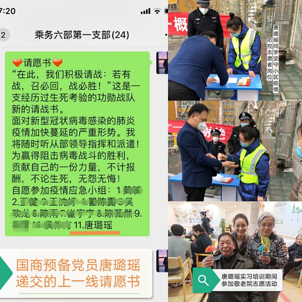 党旗所指,责任所在。预备党员2017级空中乘务一班唐璐瑶同学,不但在实习培训期间积极参加公司组织的敬老院志愿服务活动,在疫情防控阻击战打响的时刻,更是以一名预备党员的身份向公司递交了一线请愿书。她利用在家待岗的时间,主动联系所在社区物业,下沉到基层干起了志愿者。唐璐瑶同学一直坚守岗位,向社区居民做好防疫知识宣传,做好出入人员登记、认真测量体温等等,即使遇到恶劣天气仍然毫不退缩,用自己的“辛苦指数”换来社区的“安全指数”。