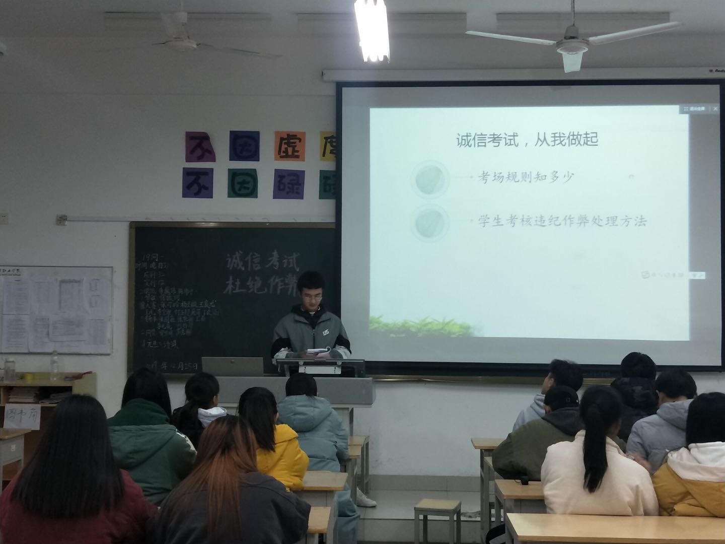 为进一步贯彻学院对严肃考风考纪的要求,12月25日晚自习,信息工程学院各班级召开了“文明考风,诚信考试”主题班会。班会上,各班级负责人就考试作弊的危害和诚信的重要性,结合近年来考试违纪案例进行了分析,带领同学们学习了《beat365中国官方网站考试违纪舞弊处理办法》,督促同学们认真复习备考,严肃考场纪律。同学们也纷纷做出保证,要进一步端正学习态度,拒绝考试作弊,强化诚信考试意识,提升自我约束能力。会后,同学们共同签订了《诚信考试承诺书》。通过班会的开展,营造了良好的诚信考试认知与期末考试复习氛围。