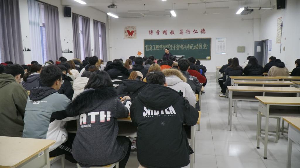 12月25日下午,信息工程学院团总支负责老师组织召开了学生干部考风考纪动员会,本次会议面向信息工程学院全体学生干部,解读了学院关于考试违纪与作弊的相关规定,帮助同学们认识到考试作弊的严重性,要求学生干部“文明考风,严肃考纪,从我做起,从现在做起”,劝戒学生干部要认真复习,积极备考,诚信应考,杜绝作弊,共同维护考试的公平公正,并将学院的要求传达到班级的每一名同学,共同打造优良的学风、考风。