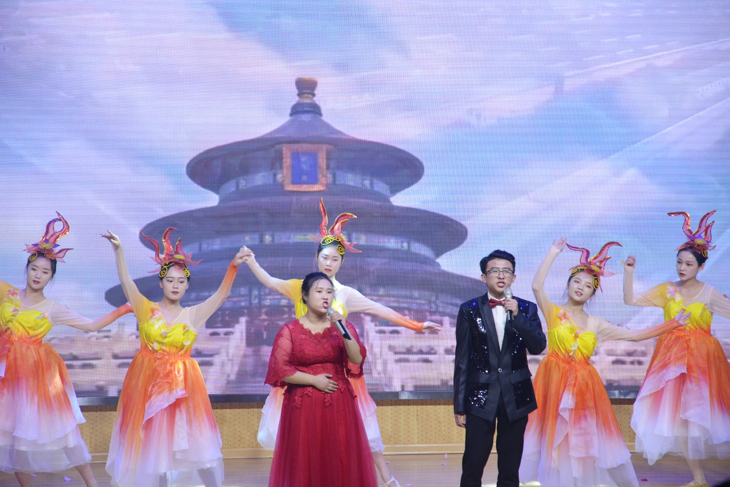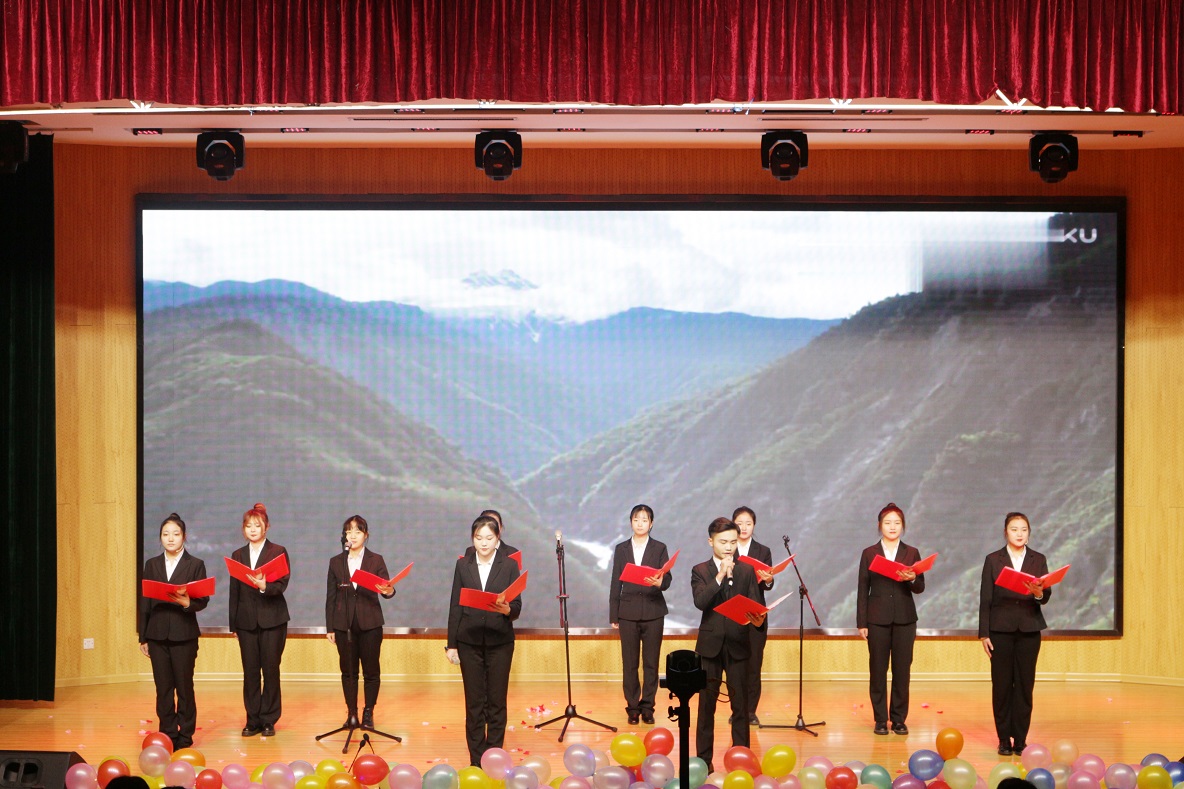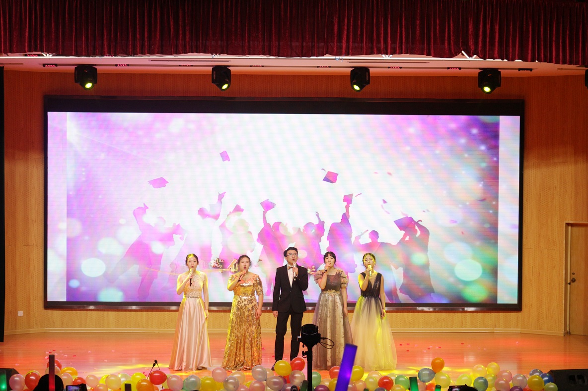 晚会前,全体师生挥舞手中的五星红旗齐声同唱《我和我的祖国》表达对伟大祖国的美好祝福。开场舞《Burning Dance》点燃了全场气氛,之后主持人闪亮登场,整场晚会正式开始。