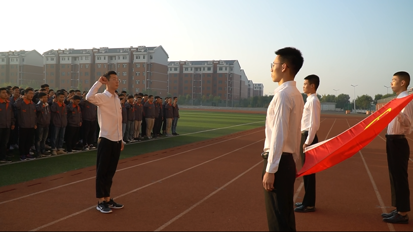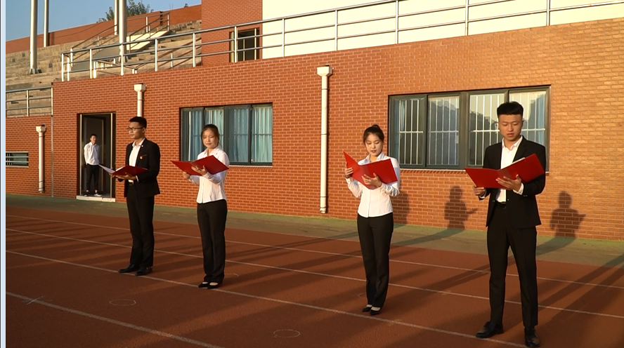 早晨6点30分,活动正式开始。国旗护卫队迈着铿锵有力的步伐,护送国旗走到升旗台前,伴随着雄壮的国歌声,鲜艳的五星红旗冉冉升起,全体人员行注目礼,齐唱国歌。升旗仪式结束后,团员代表孙恒坤同学以“我与祖国共奋进”为主题,围绕学习贯彻习近平总书记在纪念五四运动100周年大会上的重要讲话精神,结合自身的学习、生活体会做了国旗下的演讲,展现了青少年学生与祖国同呼吸、与时代共奋进的爱国主义情怀和昂扬的精神面貌。随后,2018级汽车营销与服务班高华等4名同学在国旗下进行了诗朗诵《我的祖国》,抒发对祖国的热爱之情,歌颂祖国翻天覆地的历史巨变。全体学生重温了入团誓词,通过重温誓词使青年学生更加坚定了永远跟党走,与祖国共奋进的决心和信念。