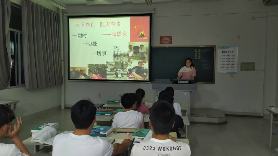 活动组织学生观看了纪念抗日战争胜利的相关影片,各班团支书又用PPT的形式展示了中华民族抗争日本侵略者的历史过程,并开展了抗日知识竞答,各班同学们积极回答关于这场伟大战争的各种问题。最后,同学们轮流在讲台上向自己的祖国、已逝的革命先烈表达自己的敬意。